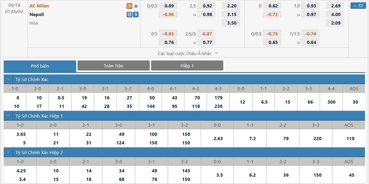 Tỷ lệ kèo cá cược bóng đá trực tuyến trận AC Milan vs Napoli