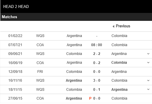 Thống kê đối đầu Argentina vs Colombia