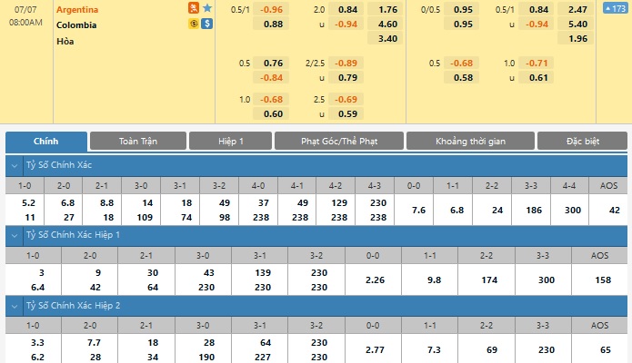 Xem tỉ lệ kèo cá cược bóng đá trực tuyến Argentina vs Colombia