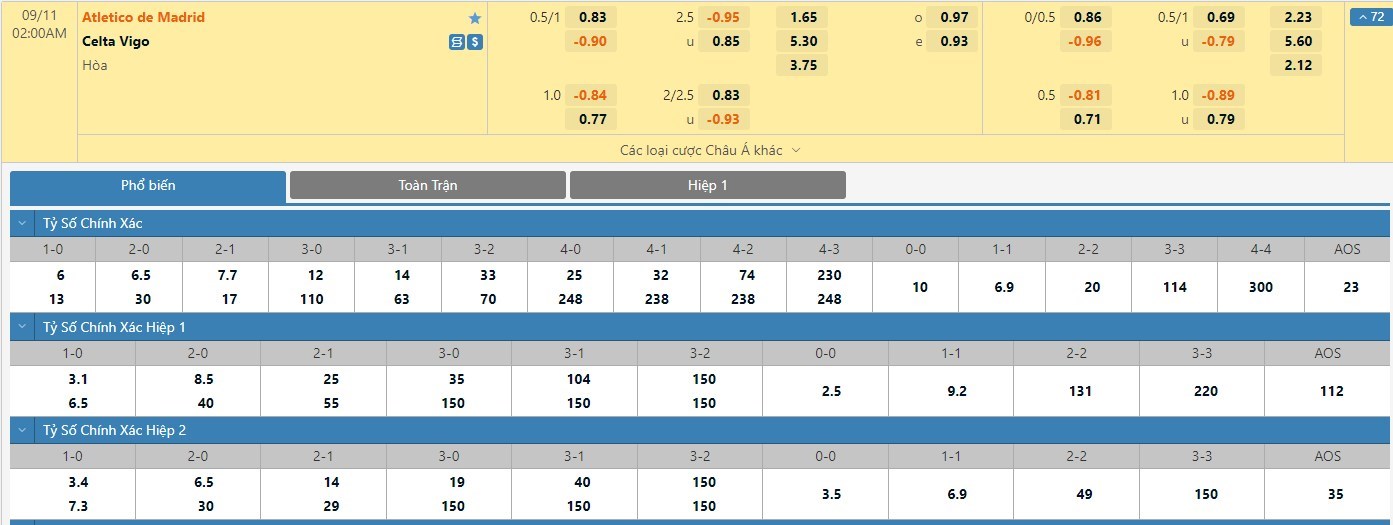 Tỷ lệ kèo cá cược bóng đá trận Atletico Madrid vs Celta Vigo
