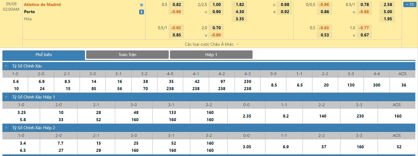 Tỷ lệ kèo cá cược bóng đá trận Atletico Madrid vs FC Porto