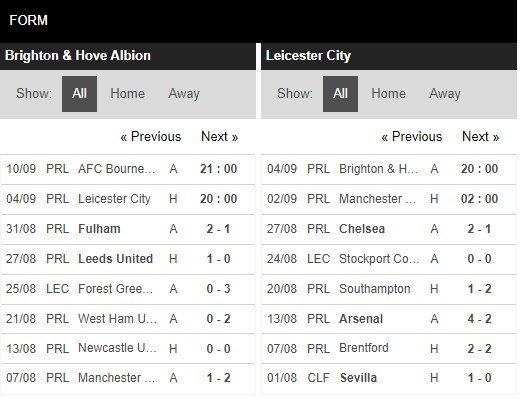 Thống kê phong độ Brighton vs Leicester City