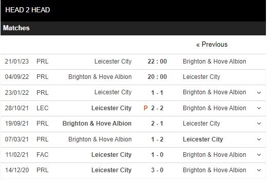 Thống kê đối đầu Brighton vs Leicester City