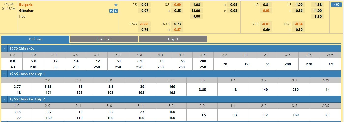 Tỷ lệ kèo cá cược bóng đá trận Bulgaria vs Gibraltar