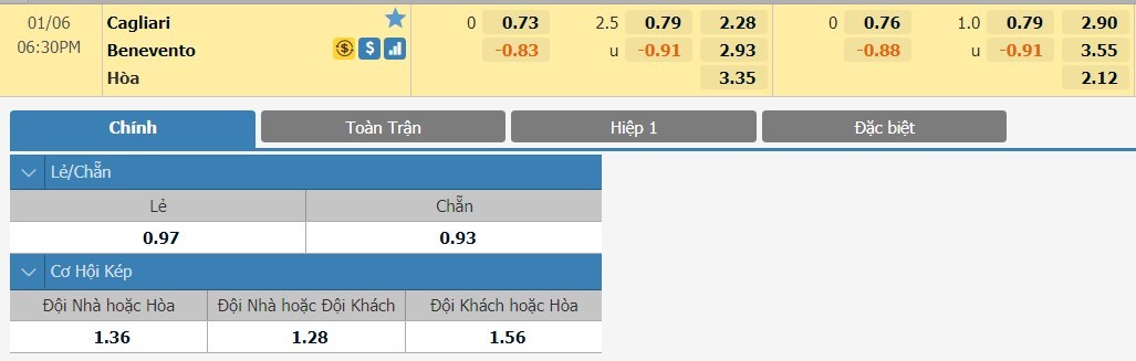 Xem tỷ lệ kèo cá cược bóng đá trực tuyến Cagliari vs Benevento