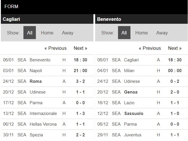 Thống kê phong độ Cagliari vs Benevento