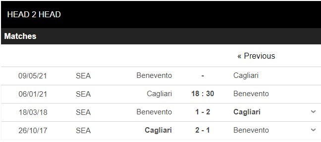 2 lần đụng độ trong lịch sử giữa 2 đội, Cagliari toàn thắng trước Benevento. Tuy nhiên, đó là kết quả cửa 2 năm trước và hiện tại vị thế của đôi bên hoàn toàn khác nhau. Với màn trình diễn vừa qua, Cagliari đang là ứng viên cho vị trí xuống hạng. Phía bên kia, Benevento đang trở lại mạnh mẽ và còn được kì vọng là ngựa ô của Serie A năm nay. 4 trận gần nhất tại sân nhà, Cagliari không thể thắng. Ngược lại, Benevento trong 4 lần phải làm khách gần nhất chỉ có 1 thất bại, 1 hoà và có tới 2 thắng lợi.