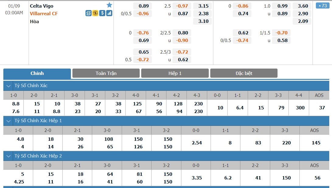 Tỷ lệ kèo cá cược bóng đá trận Celta Vigo vs Villarreal