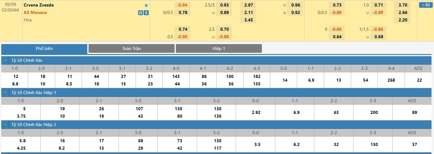 Tỷ lệ kèo cá cược bóng đá trực tuyến trận Crvena Zvezda vs Monaco