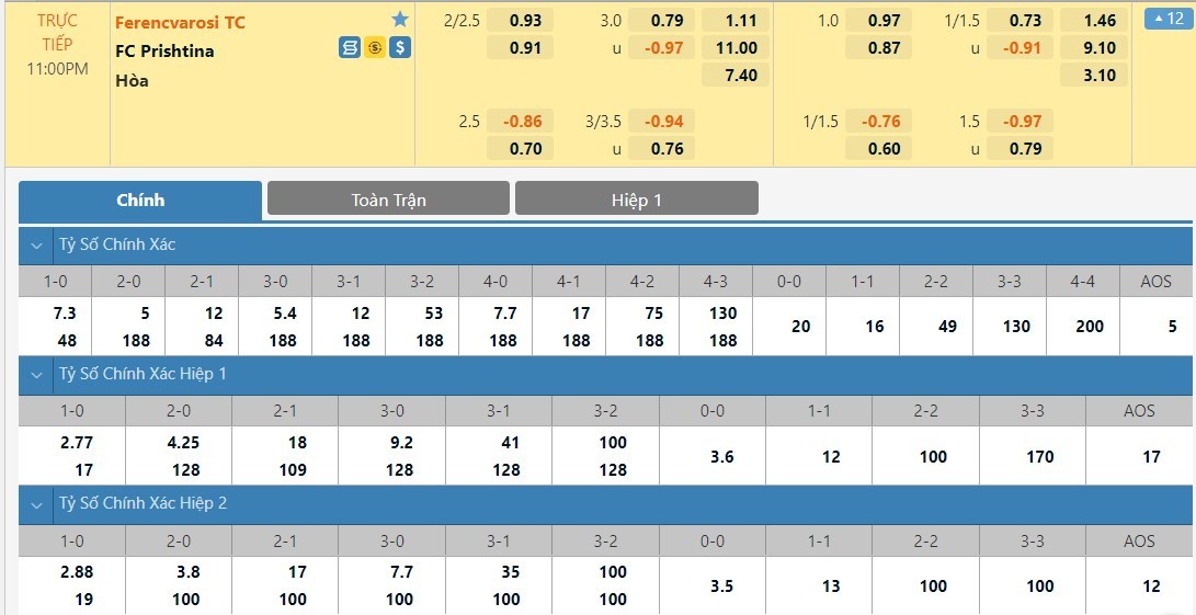 Tỷ lệ kèo cá cược bóng đá trực tuyến trận Ferencvaros vs FC Prishtina