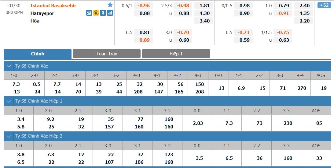 Tỷ lệ kèo cá cược bóng đá trận Istanbul Basaksehir vs Hatayspor