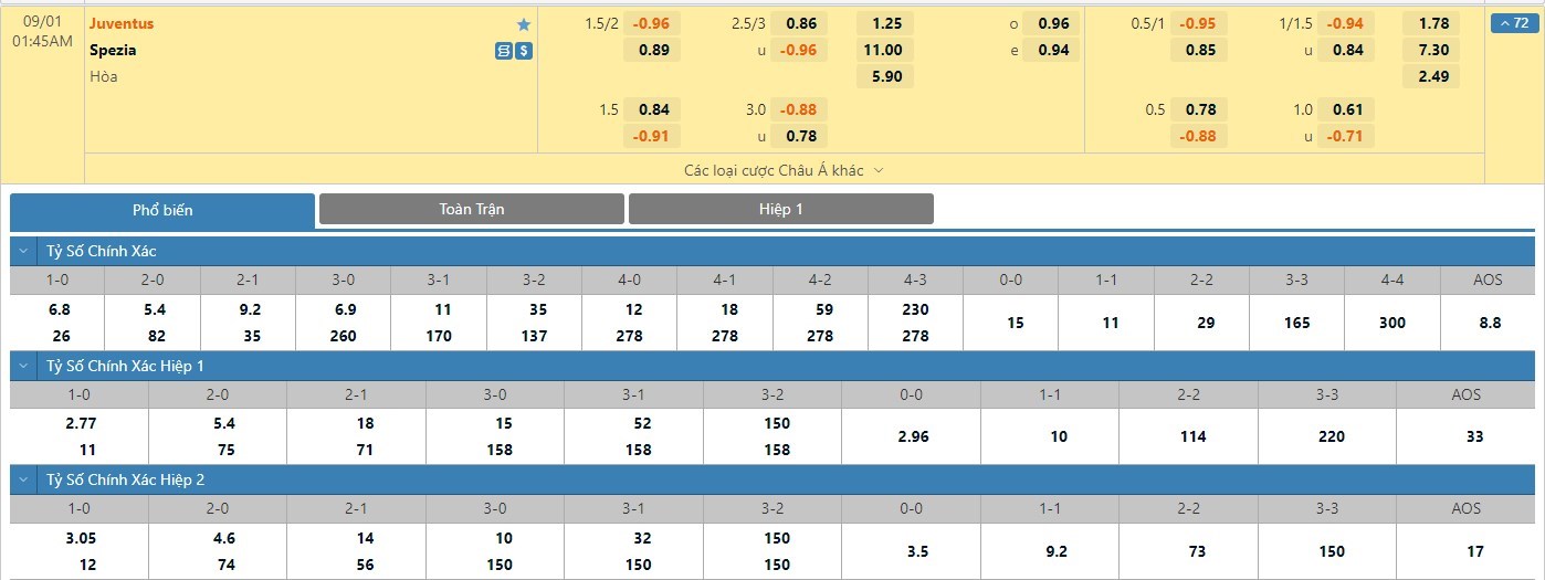 Tỷ lệ kèo cá cược bóng đá trận Juventus vs Spezia