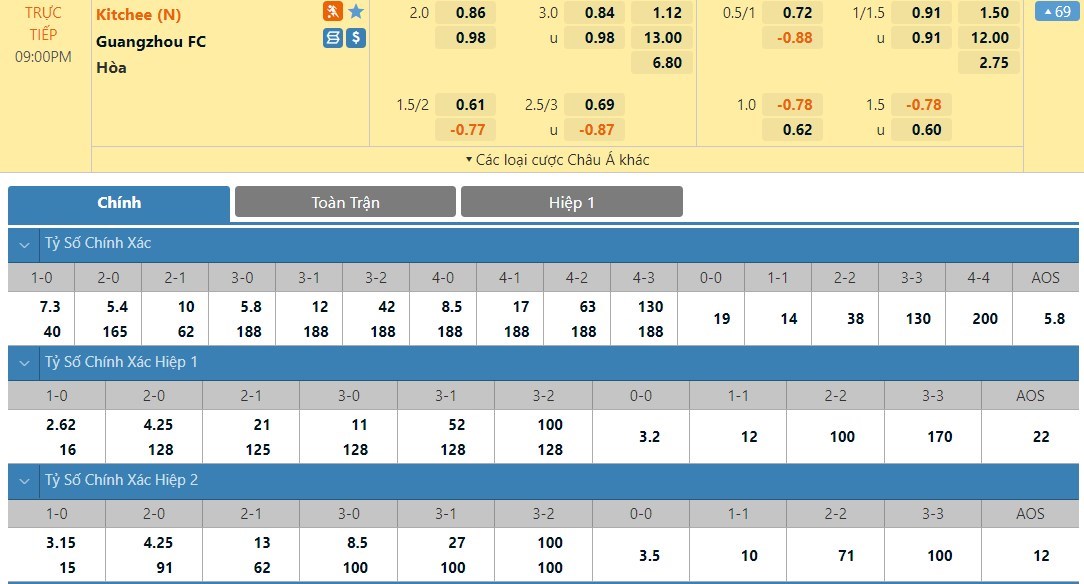 Tỷ lệ kèo cá cược bóng đá trực tuyến trận Kitchee vs Guangzhou FC