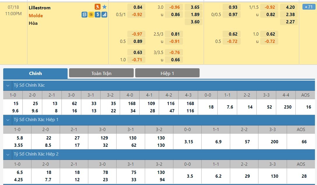 Tỷ lệ kèo cá cược bóng đá trực tuyến trận Lillestrom vs Molde