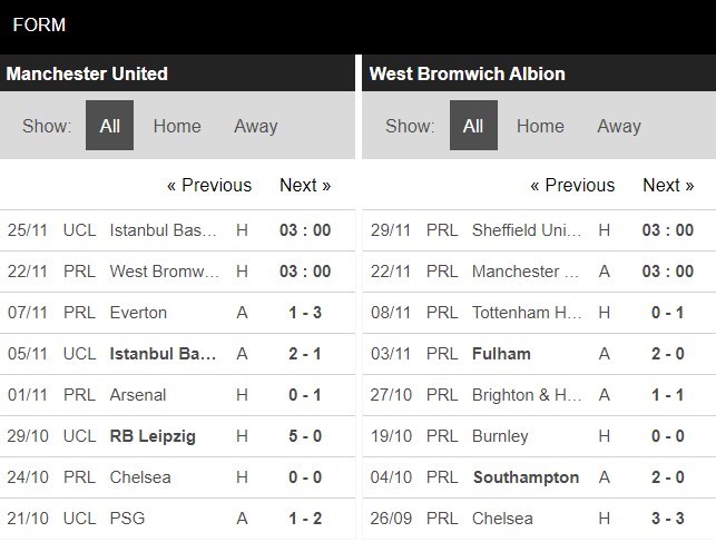 Thống kê phong độ Manchester United vs West Bromwich Albion