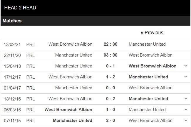 Thống kê đối đầu Manchester United vs West Bromwich Albion