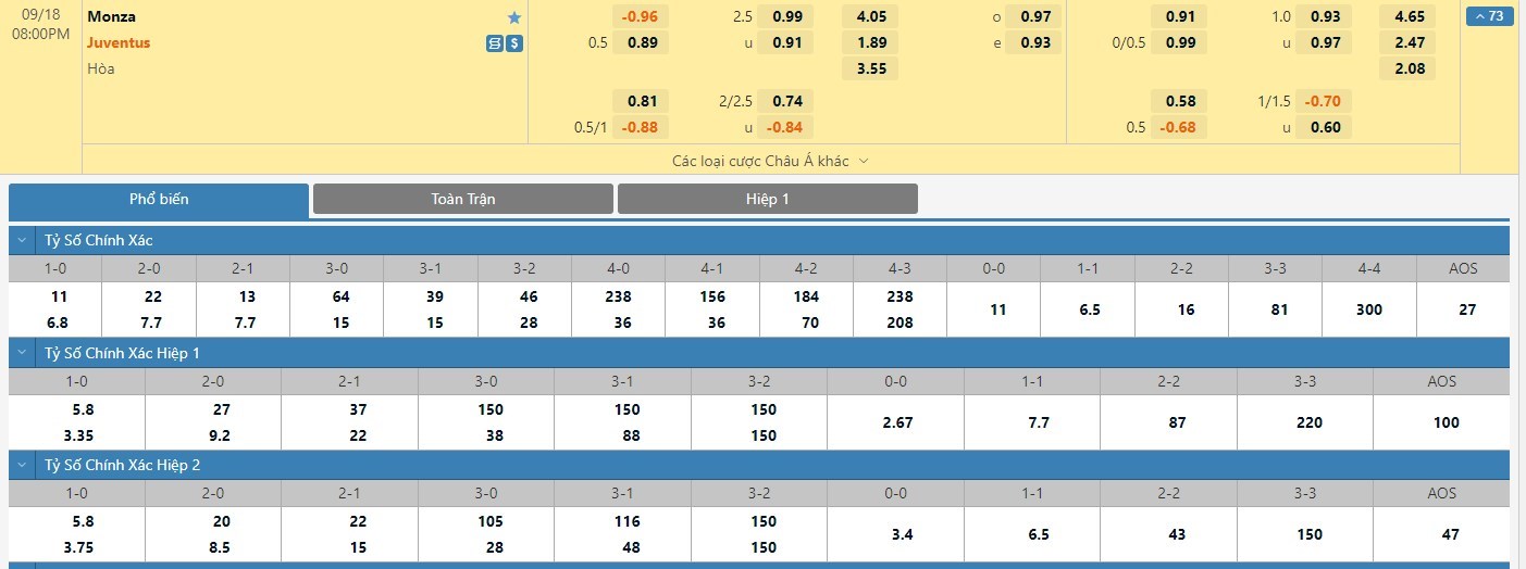 Tỷ lệ kèo cá cược bóng đá trận Monza vs Juventus