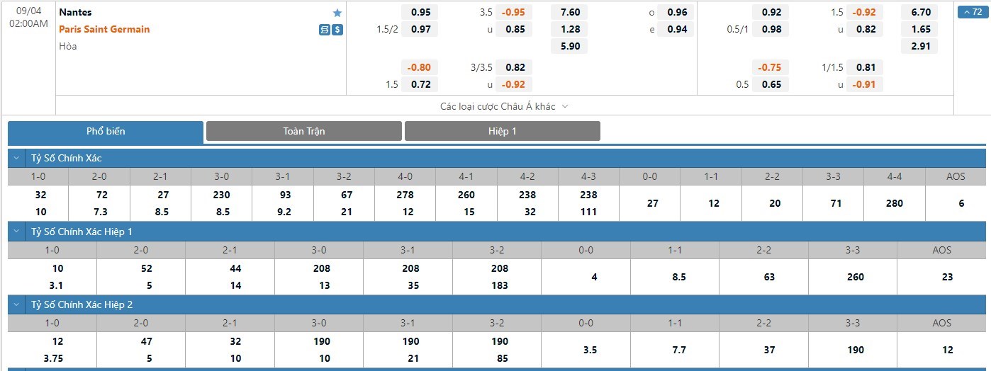 Tỷ lệ kèo cá cược bóng đá trận Nantes vs Paris Saint Germain