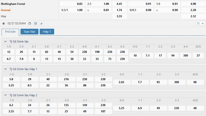 Tỷ lệ kèo cá cược bóng đá trận Nottingham vs Arsenal