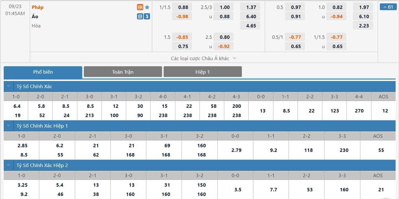 Xem tỷ lệ kèo cá cược bóng đá trực tuyến Pháp vs Áo