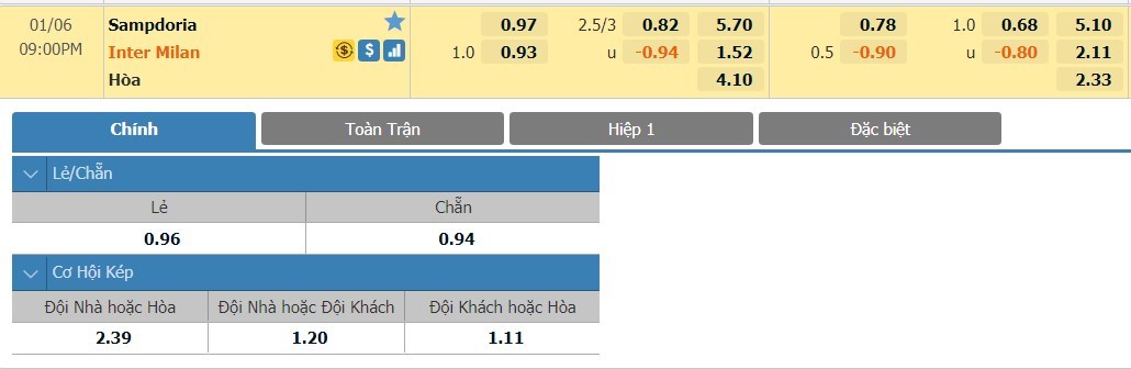 Tỷ lệ kèo cá cược bóng đá trực tuyến trận Sampdoria vs Inter Milan