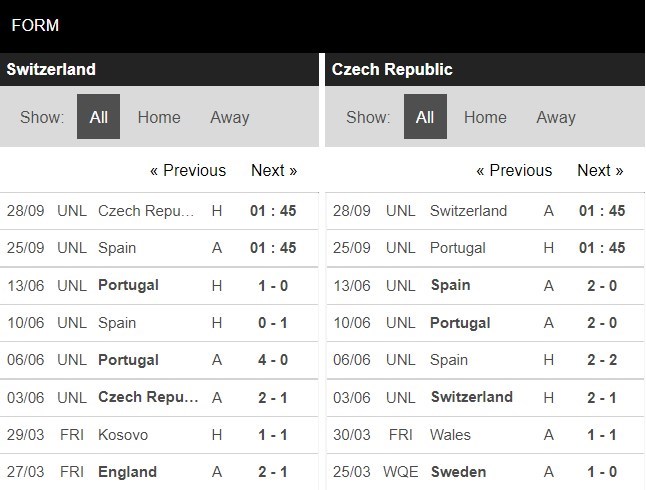 Bên cạnh điểm tựa sân bãi thì phong độ của Thụy Sĩ cũng đang tốt hơn so với đối thủ. Cụ thể, Thụy Sĩ thắng liên tiếp 2 trận gần nhất, còn Cộng hòa Séc đã thua liền cả 3 lần ra sân gần đây.
