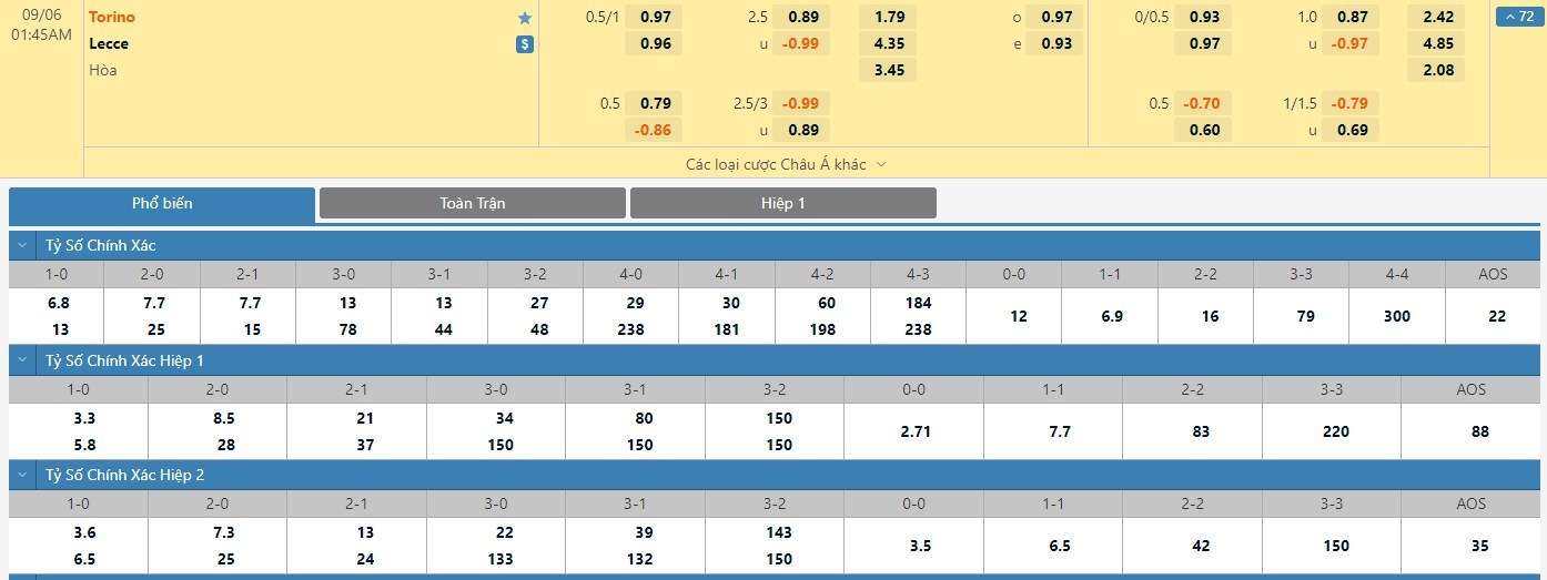 Tỷ lệ kèo cá cược bóng đá trận Torino vs Lecce