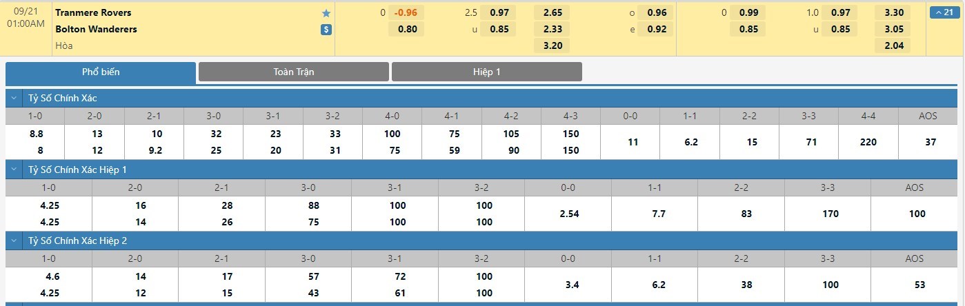 Tỷ lệ kèo cá cược bóng đá trực tuyến trận Tranmere Rovers vs Bolton Wanderers