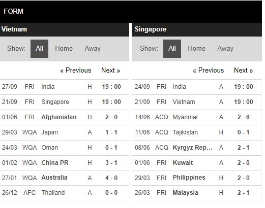Thống kê phong độ Việt Nam vs Singapore