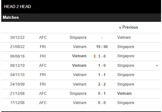 Thống kê đối đầu Việt Nam vs Singapore